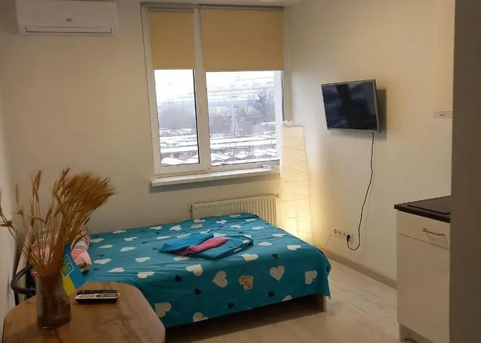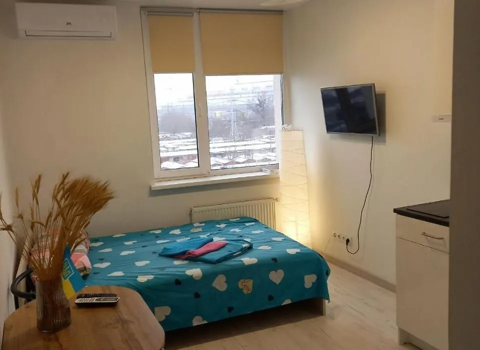 The apartment lies in the Holosiivskyj district of Kyiv, 2.8 km from the historic Vydubychi Monastery.